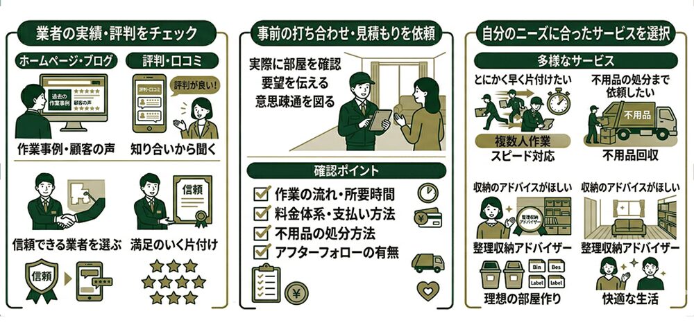 部屋の片づけを業者に依頼する際、適切な業者選びが重要です。ここでは、片付け業者を選ぶ際のポイントを紹介します。