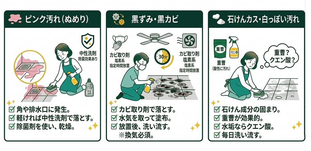 洗い場の床に出る黒・紫・ピンクの汚れは、温度・湿度・養分の条件がそろうことで発生しやすくなります。特に浴槽まわりや排水口、床の隅などはピンク汚れが発生しやすく、こまめなお手入れが必要です。