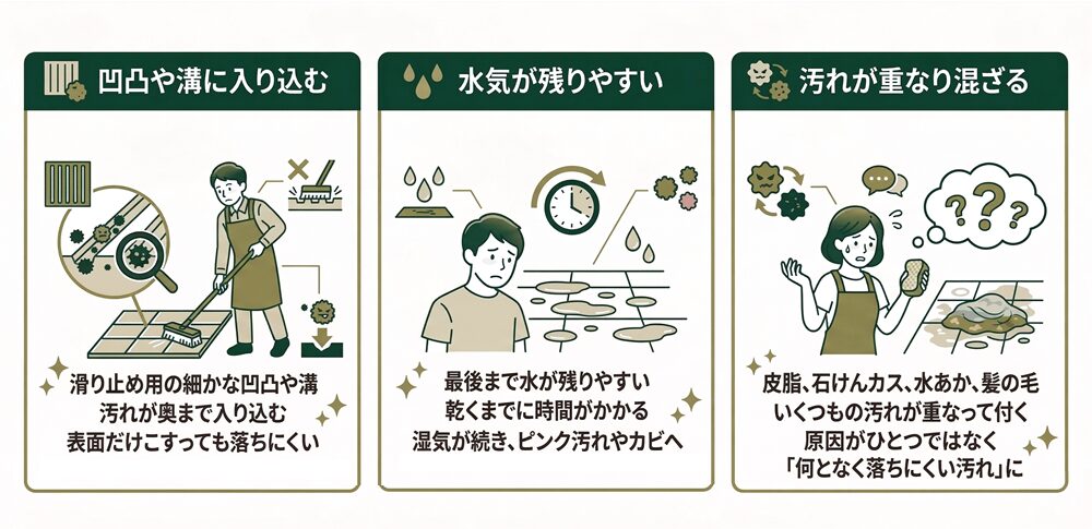 お風呂の床には、皮脂汚れだけでなく、石けんカス、水あか、髪の毛などいくつもの汚れが重なって付きます。そのため、原因がひとつではなく、「何となく落ちにくい汚れ」になりやすいのです。